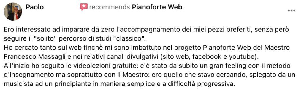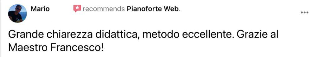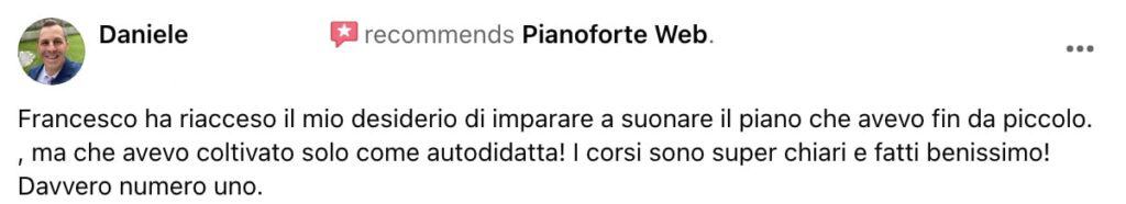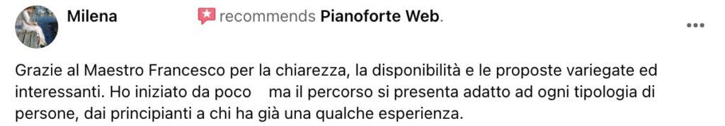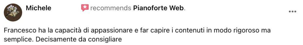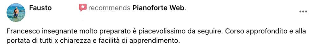 Lezioni variegate e molto chiare! Francesco è molto preparato e insegna con semplicità e attenzione! Consiglio Pianoforte Web sia a chi si avvicina al pianoforte per la prima volta, sia per chi vuole approfondire e migliorare!