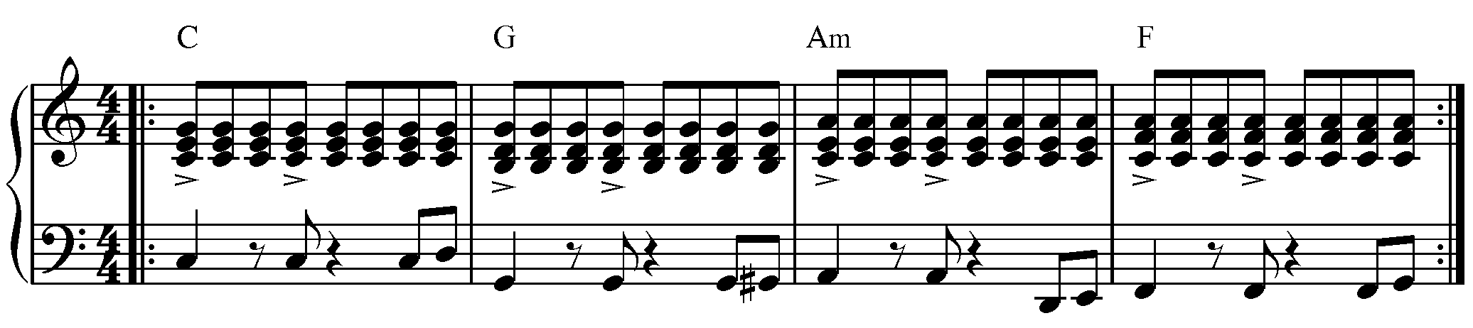 Nel primo esempio ritmico, suoniamo in corrispondenza della pulsazione con l’accordo della mano destra mentre la mano sinistra suona la nota fondamentale ripetuta all’ottava sul battere del primo movimento e viene mantenuta per tutta la battuta.
