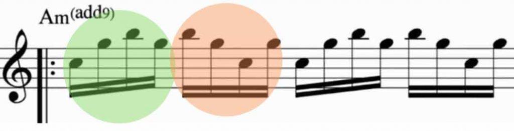 L’esempio numero 2 consiste nella stessa idea ritmica precedente ma con una variazione nella direzione e nell’ordine delle note.