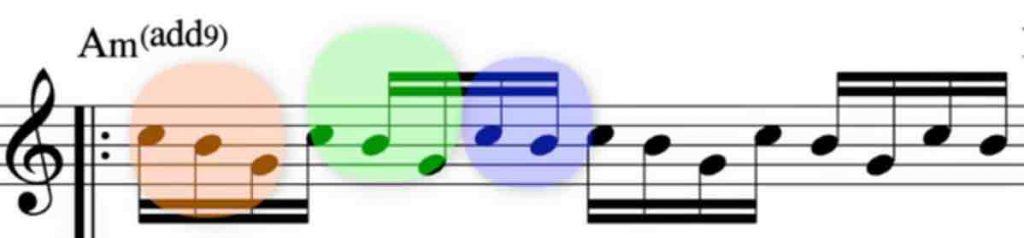 La mano sinistra suonerà questi accordi in forma di arpeggio a parti aperte con l’aggiunta della nona.