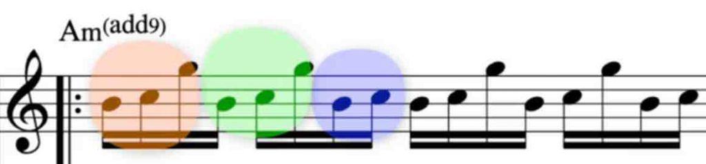Ti ricordo che per visualizzare velocemente la nona di ogni accordo puoi pensare alla seconda trasportata un’ottava sopra. Osserviamo la disposizione delle note con gli accordi in forma add9.