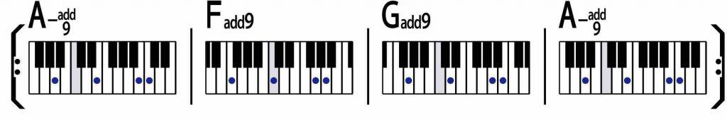 Lo studio dell’arpeggio in forma add9 per la mano sinistra è trattato in modo approfondito nel corso “Accompagnare al Pianoforte Vol.2″.
