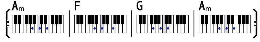 Prima di costruire le melodie, analizziamo la progressione di accordi sulla quale si sviluppano.
