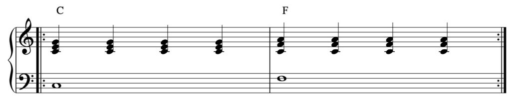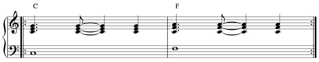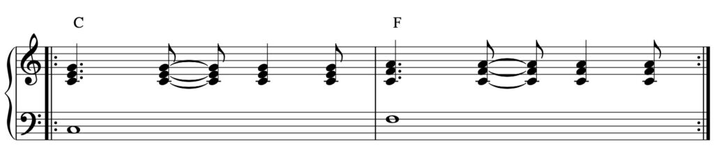 In questo esempio, la mano destra suonerà il ritmo mentre la mano sinistra suonerà la nota fondamentale dell’accordo per tutta la durata della battuta.
