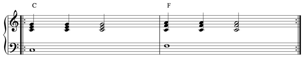 - Accordo di Fa maggiore: Questo accordo è composto dalle note Fa (F), La (A) e Do (C). Per facilità di passaggio, lo suoneremo in secondo rivolto, mantenendo la nota Do in comune con il precedente accordo.