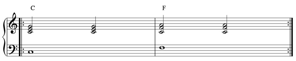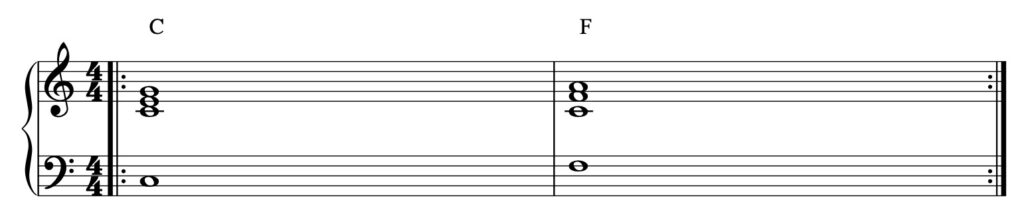 Se parti completamente da zero ti consiglio di assimilare bene questo esercizio prima di procedere con i successivi. All’inizio una delle difficoltà maggiori è data dal passaggio da un accordo all’altro. Nell’esempio successivo questo passaggio sarà più rapido e dovremo consolidare bene la nostra manualità nel passaggio da Do a Fa.