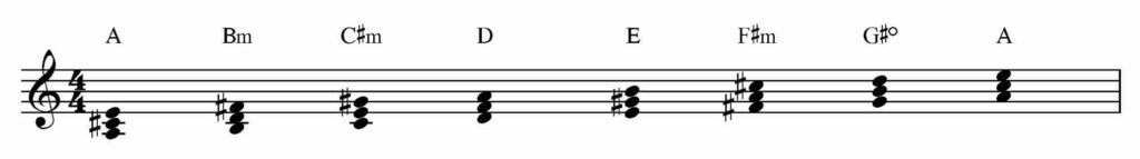 Questi accordi corrispondono a primo, quarto e quinto grado della scala maggiore armonizzata di La.