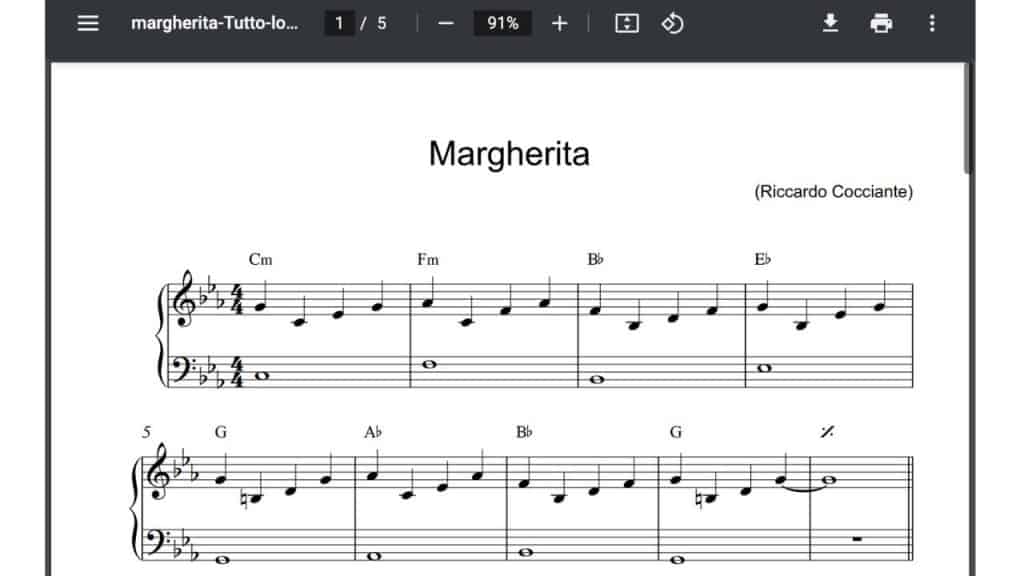 Lo spartito con l'accompagnamento completo del brano nota per nota con sopra le sigle degli accordi.