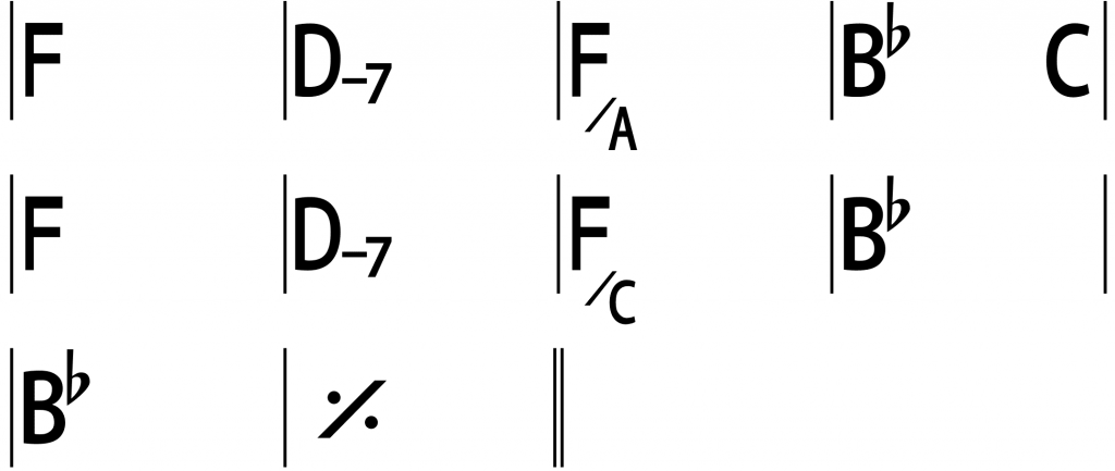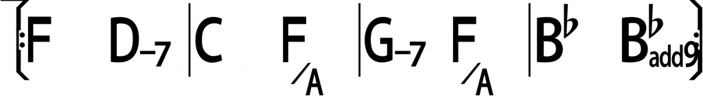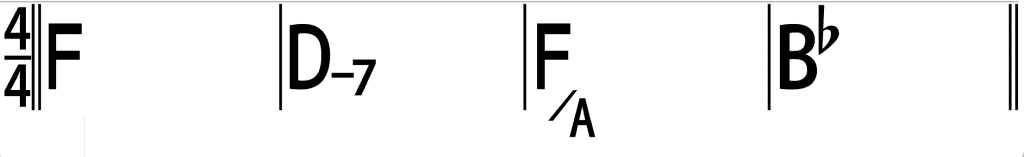 Come già citato, i primi accordi della parte introduttiva sono l’accordo di Fa maggiore, Re minore 7.ª, Fa maggiore e Si bemolle.