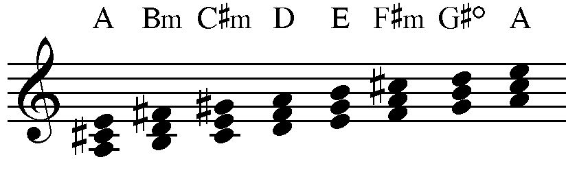 Il brano si trova in tonalità di La maggiore, quindi visualizziamo la scala maggiore e la scala maggiore armonizzata che ci servirà per effettuare l’analisi armonica della successione di accordi.