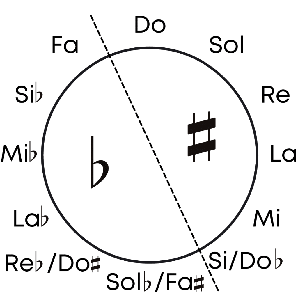 La tonalità di Do maggiore, che come abbiamo appena visto non ha alterazioni, verrà collocata nel gruppo dei diesis in modo da rendere simmetrica la suddivisione dei due gruppi.
