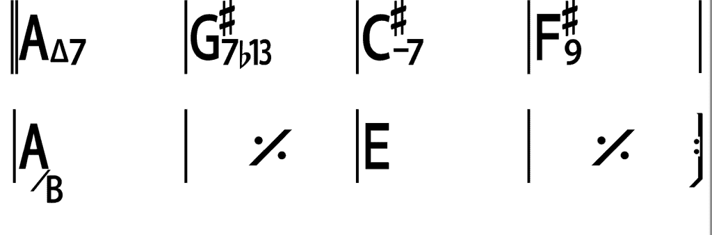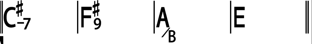 Sui primi due accordi (C#min e F#9) vengono suonati degli accordi senza fondamentale con terza, quinta, settima e nona.