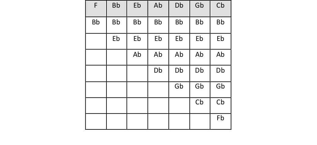Nella seconda tabella visualizziamo la disposizione delle alterazioni per le tonalità appartenenti al gruppo dei bemolle.