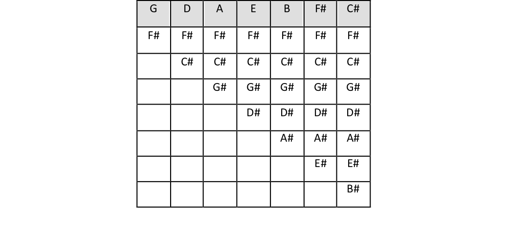 Il numero di inserimento di alterazioni è progressivo: si va da G che contiene un diesis a C# che ne contiene 7.