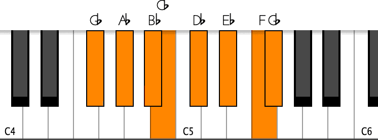 La scala di Sol bemolle inizia posizionando le dita 2, 3 e 4 sulle note Solb, Lab e Sib. Dopo proseguiamo con il primo passaggio del pollice e alterniamo il Gruppo 3, Gruppo 4, Gruppo 3 e infine dita 1 e 2.