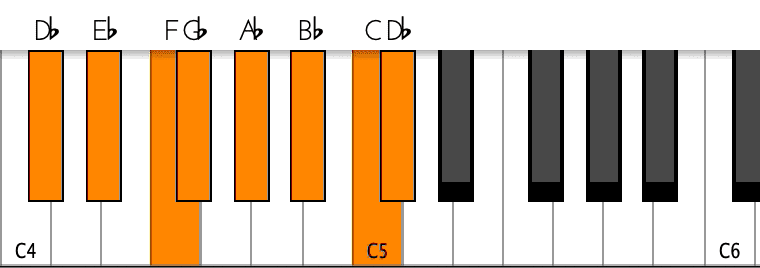 La scala maggiore di Re bemolle presenta questa diteggiatura per la mano destra: dito 2 su Re bemolle, 3 su Mi bemolle, poi prosegue con il Gruppo 4, Gruppo 3, Gruppo 4 e infine dita 1 e 2.