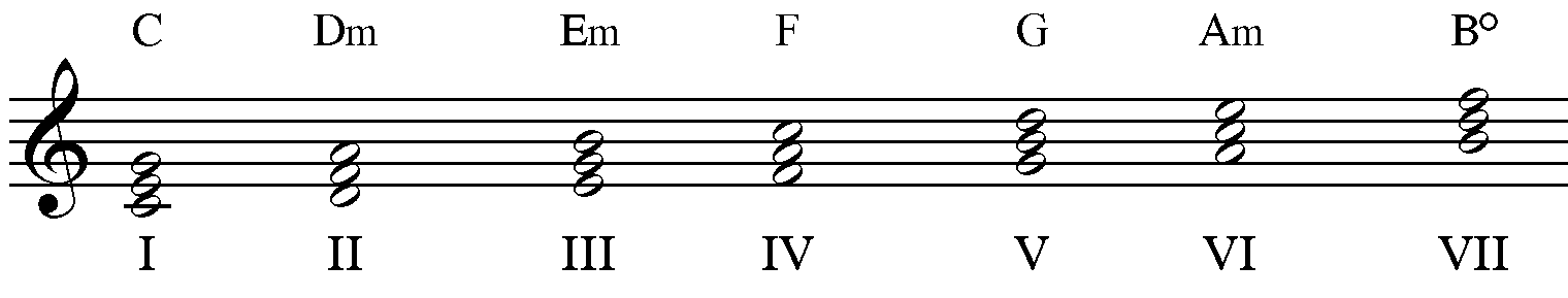 I numeri romani mostrati sotto ciascun accordo indicano la loro funzione all’interno della tonalità.